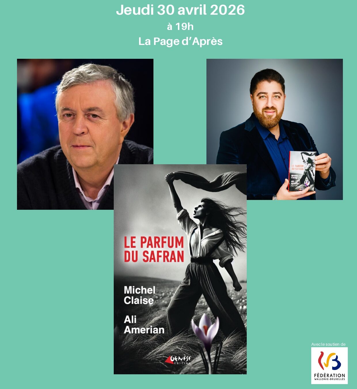 Voilà un livre brûlant d’actualité! Un récit écrit à 4 mains par l’ancien juge d’instruction Michel Claise et l’avocat iranien Ali Amerian. Le parfum du safran est un roman poignant sur l’exil, l’engagement et l’espoir d’un Iran libre. Les auteurs ont choisi la fiction pour protéger l’anonymat des protagonistes, mais les faits sont bien réels! A découvrir le jeudi 30 avril à 19h, en compagnie du duo, interrogé par un autre ancien magistrat et client fidèle, Thierry Marchandise.